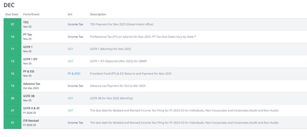 Compliance Calendar for GST, Income tax and labour Law is as Follows:
